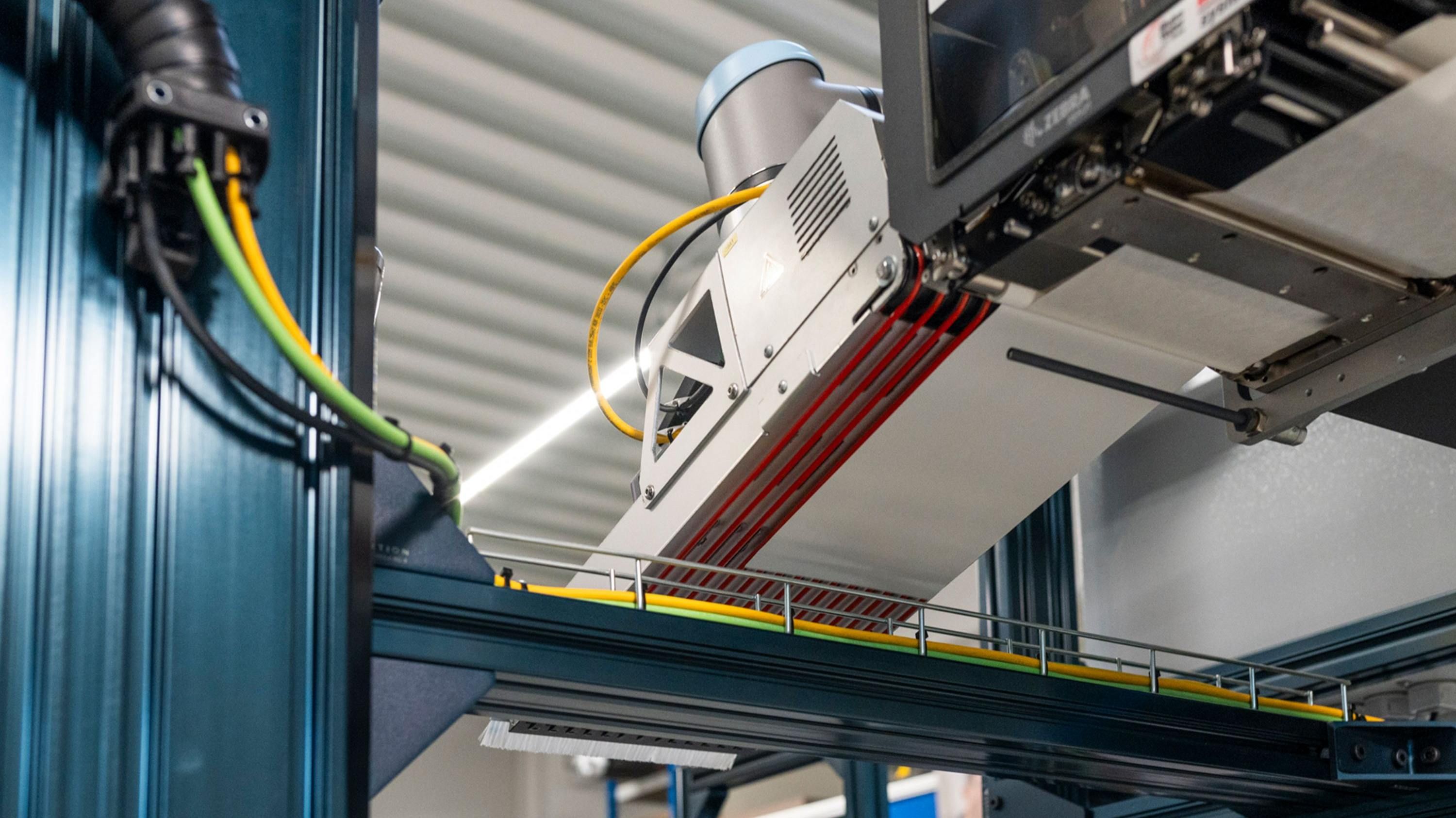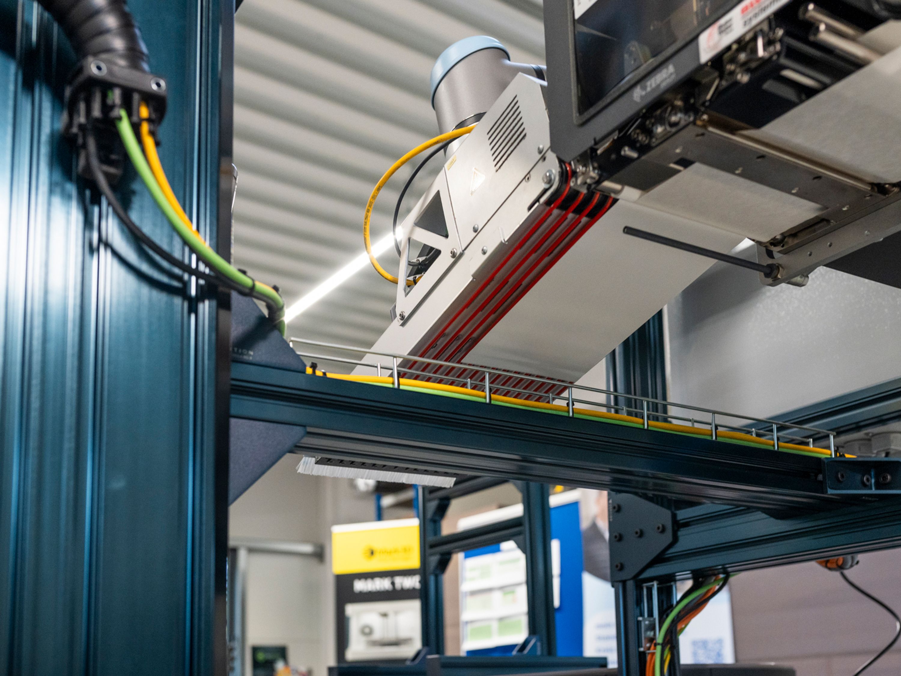 Der Legi-Air 4050B-R arbeitet mit einem Roboter, der über einen individuell gestalteten Applikationsstempel verfügt. Dieser verfährt in die Aufnahmeposition vor dem Druckspender, löst den Druckvorgang aus und übernimmt das frisch bedruckte Etikett. Anschließend bringt der Roboter das Etikett exakt an die zuvor definierte Position auf dem Produkt auf. Dieses Zusammenspiel von Druckspender und Robotik gewährleistet eine hochpräzise, wiederholgenaue Etikettierung – auch bei komplexen Produktgeometrien oder schwer zugänglichen Stellen.
