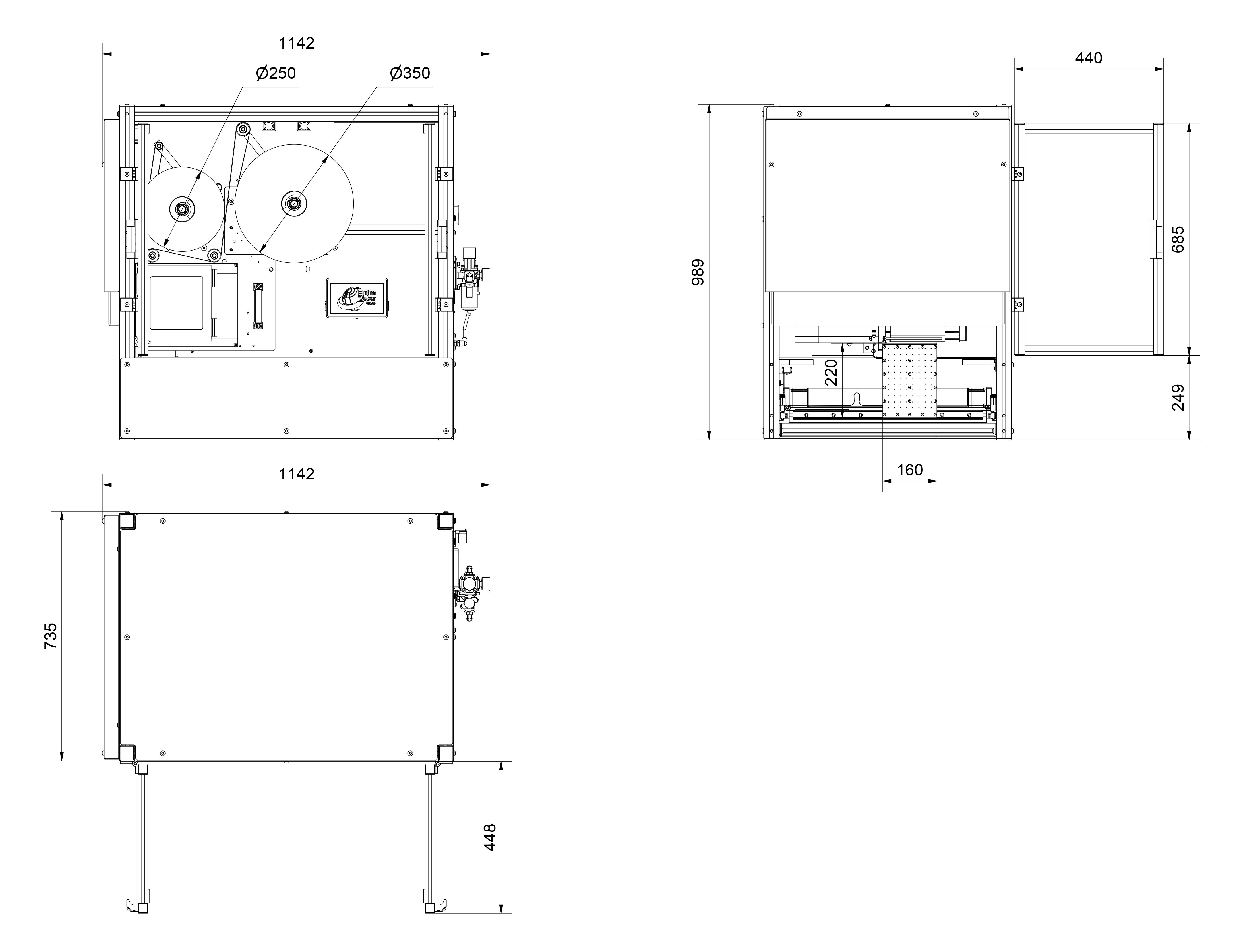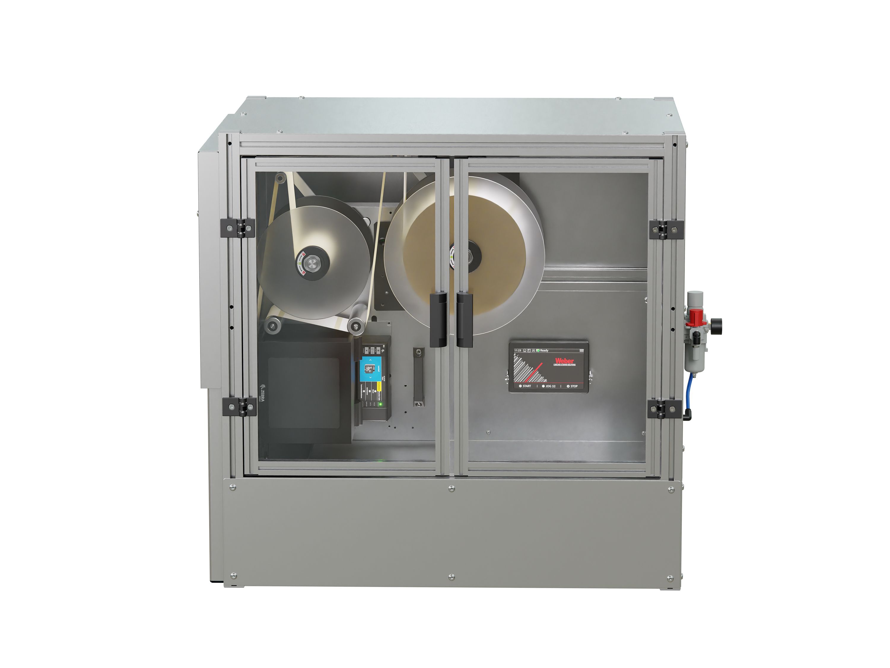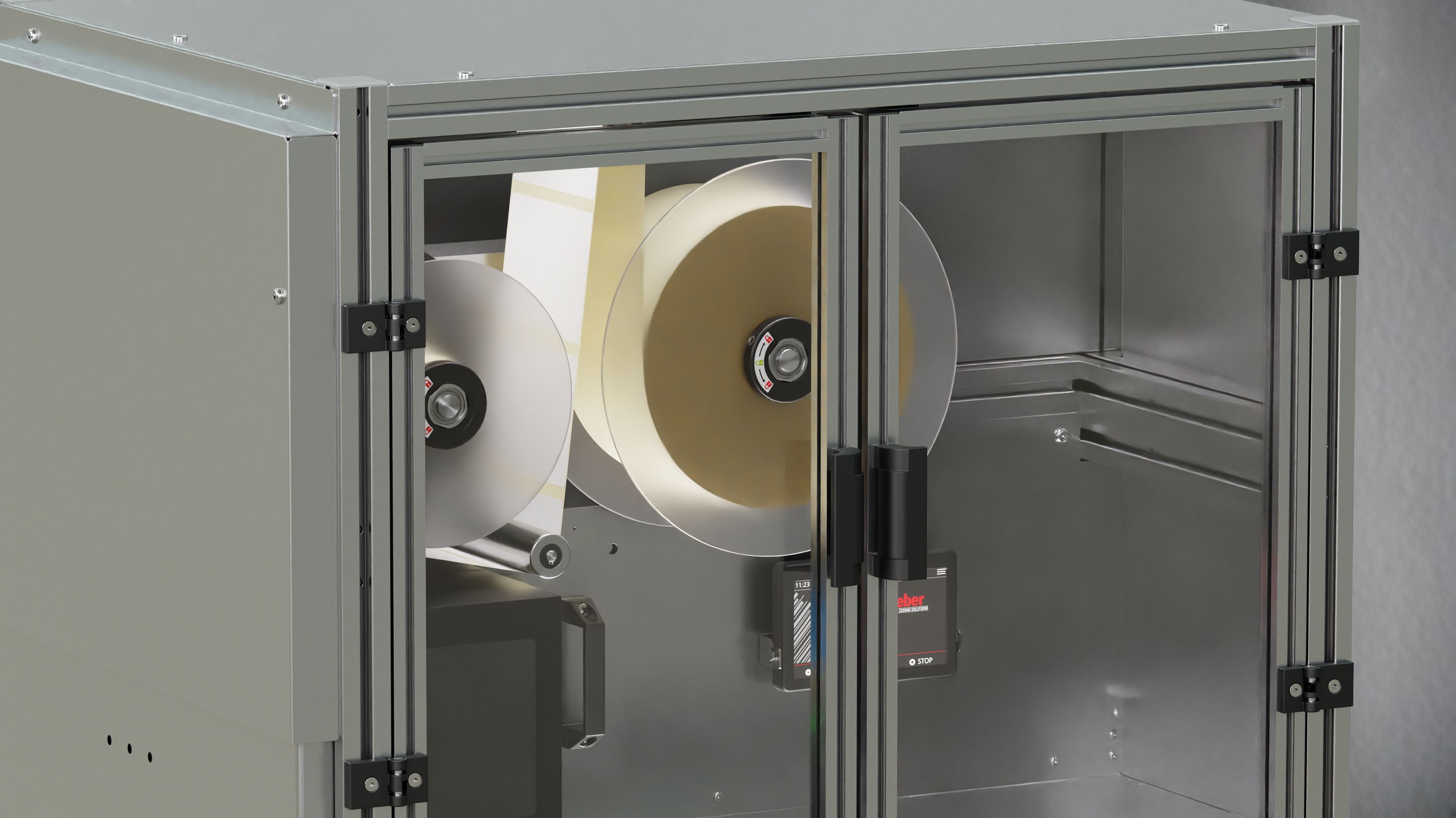 Das rechteckige Gehäuse des Palettenetikettierers besteht aus einer Profilrahmen-Konstruktion, die mit Ausnahme der transparenten Seitentür von Edelstahlblechen umschlossen ist. Für einen einfachen und schnellen Materialwechsel sind Auf- und Abwicklungseinheit sowie Druckmodul verschiebbar und leicht zugänglich.