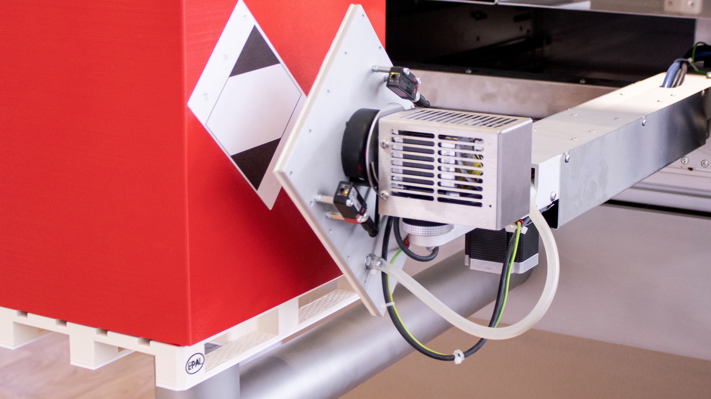Der erste Sensor dient als optisch variabler Hubsensor. Er erfasst den Abstand zur Palette und löst je nach Einstellung ab circa 15 Millimetern Entfernung das Abblasen des Etiketts vom Spendestempel sowie den Rückzug des Stempels in die Grundposition aus. Der zweite verbaute optische Sensor ist nach innen gerichtet, Richtung Federlagerung des Spendestempels.